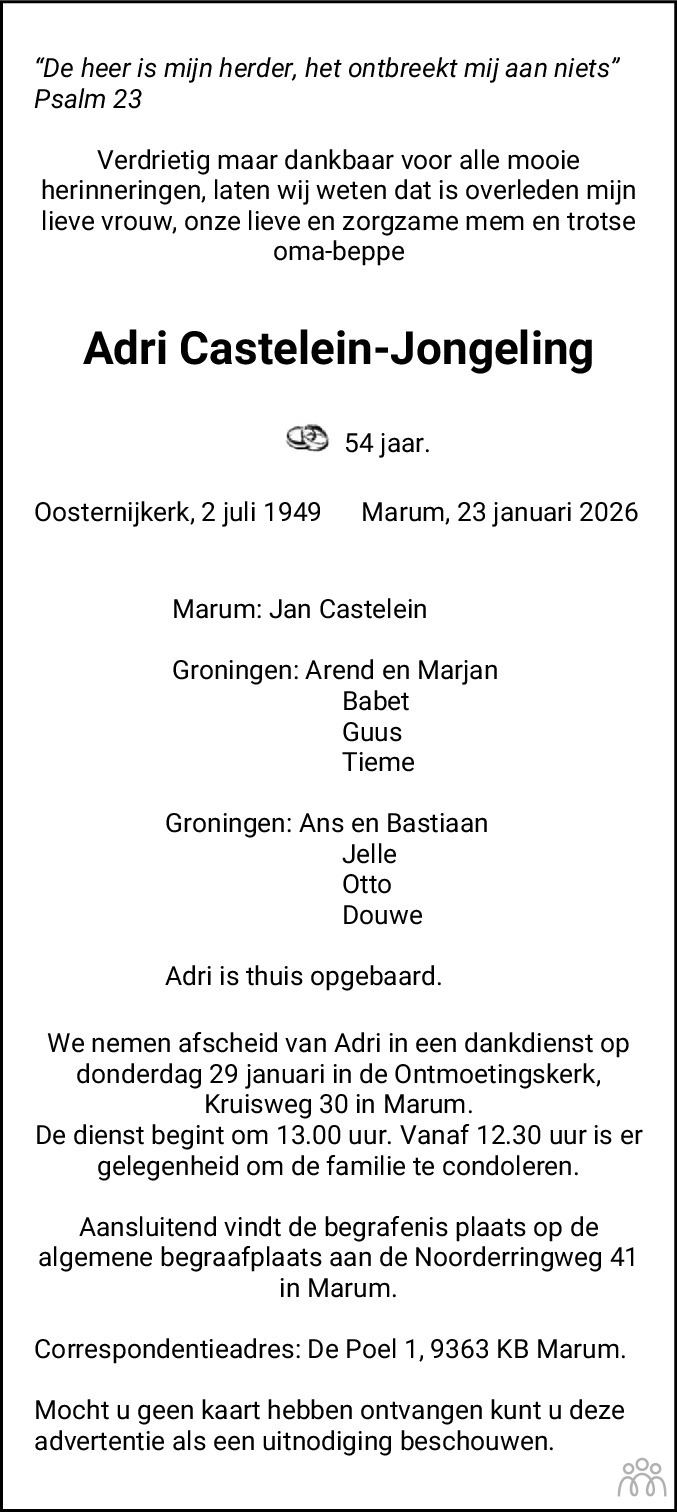 Beste Jan, kinderen en kleinkinderen. Onze condoleances met het overlijden van Adrie. Tijdens haar scriba periode hebben Adrie en ik veelvuldig contact met elkaar gehad, van haar kant kwam er regelmatig een belletje om mij te herinneren aan het e.e.a. Het was een zeer prettig contact. Ik heb Adrie leren kennen als een warme betrokken vrouw. We wensen jullie allen veel sterkte voor vandaag en de tijd die hierna komt nu het afscheid zo definitief is. Met een warme groet, Geert en Henny Posthuma
