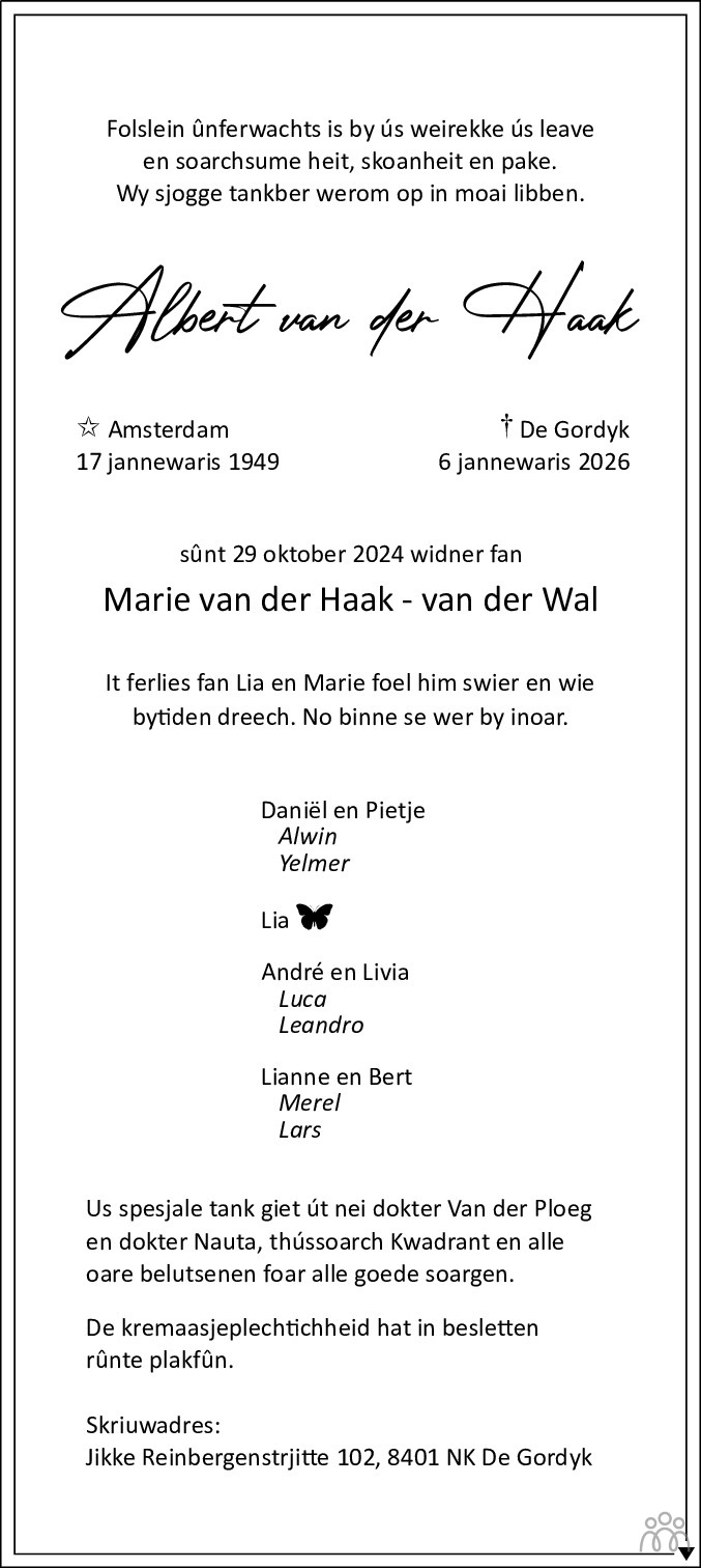Amsterdam op 17 januari 1949 •Gorredijk op 6 januari 2026