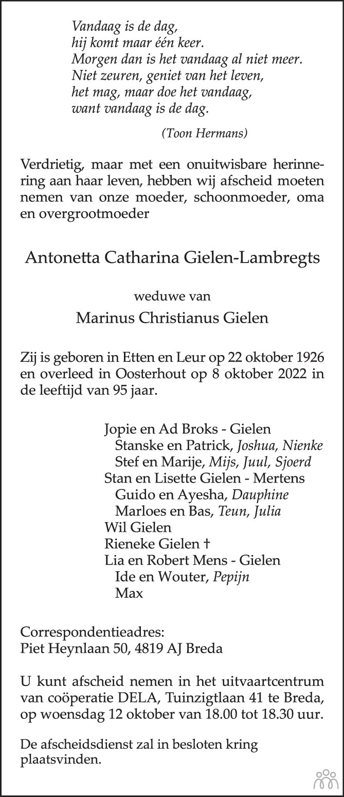 Etten en Leur op 22 oktober 1926 •Oosterhout (Nb) op 8 oktober 2022