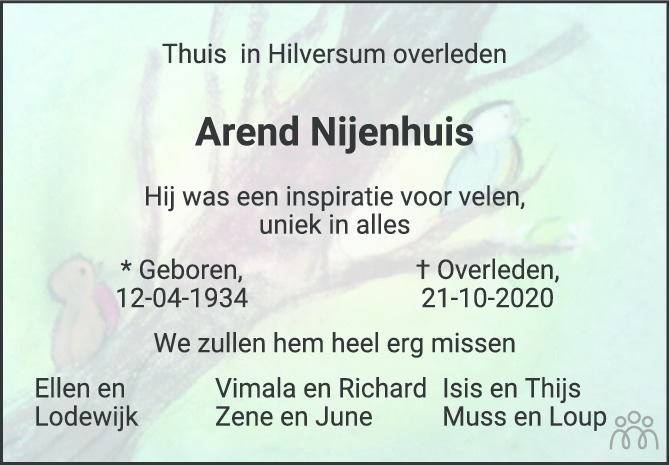 mijn deelneming. Ik ontmoette Arend voor het eerst in 1949. Boy was met hem bevriend en hij heeft 1 x met mijn jongens gerepeteerd. Dat was, denk ik, geen succes..... Goede herinneringen.... Sterkte allemaal.