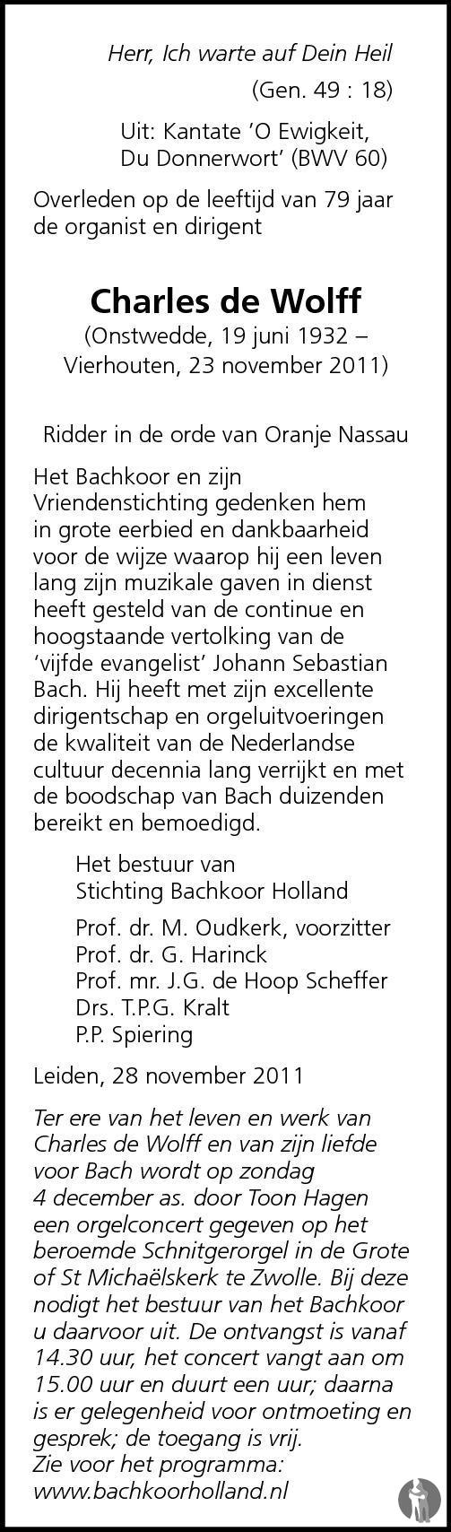Vandaag trof mij het nieuws dat de musicus organist en dirigent Charles de Wolff is overleden. Middels dit bericht wil ik jullie als familie, vrienden en kenissen sterkte wensen voor nu en de komende tijd met dit grote verlies.
