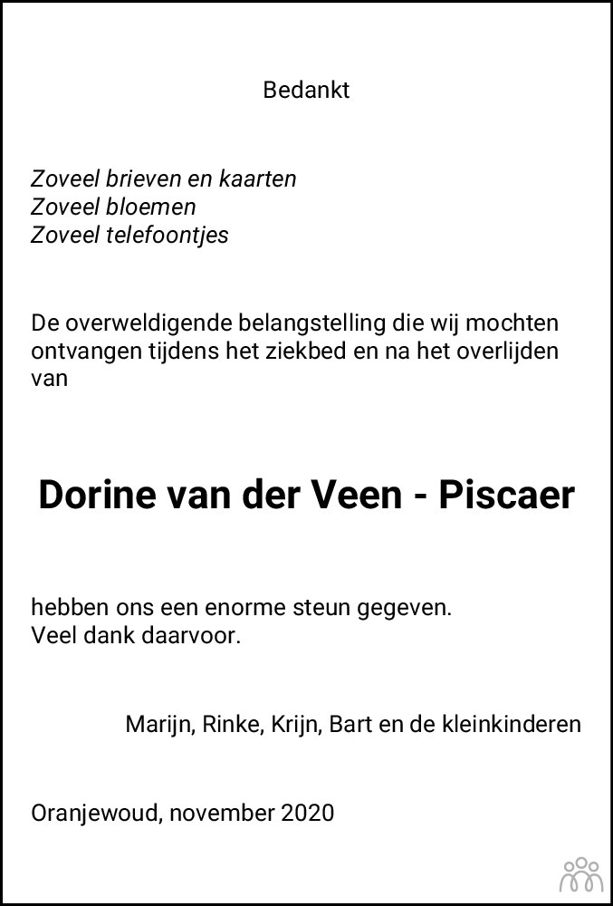 Lieve Marijn en Rinke en jullie gezinnen, Geschokt lees ik het overlijdensbericht van jullie mam... Onze dartele Doortje, nog veel te jong. Nooit meer de oude geworden na het overlijden van haar Bram. Ze vond het zo moeilijk om door te gaan zonder hem, maar had jullie gelukkig nog. Daar deed ze haar best voor..Wat een groot verdriet en gemis. Mijn intens medeleven. Het was een lief en mooi mens. Ik wens jullie kracht, warmte en heel veel lieve mensen om je heen, die jullie kunnen troosten. Maar vooral heel veel dierbare en fijne herinneringen. Jullie leven in haar en paps voort...Dikke knuf, Vicky