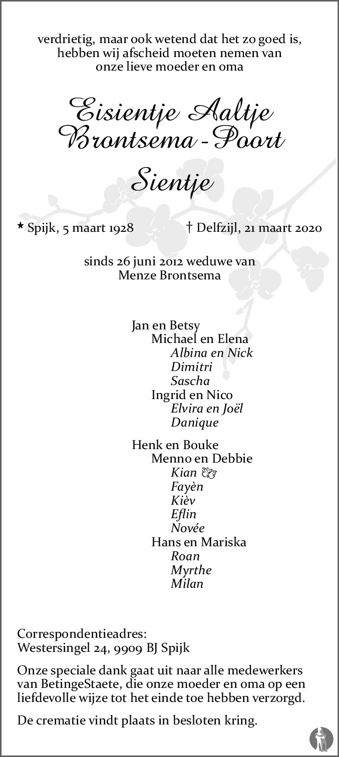 Spijk (Gn) op 4 maart 1928 •Delfzijl op 21 maart 2020