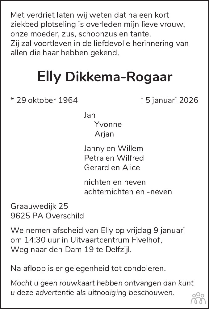 Jan, Yvonne en Arjan, gecondoleerd met het onverwachte overlijden van Elly. Ook de rest van de familie gecondoleerd. Liefs