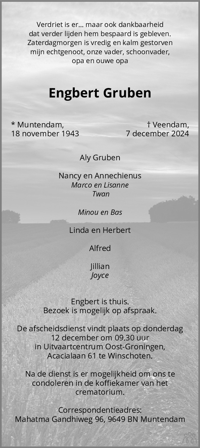 Beste Fam. Heel veel sterkte gewenst,Engbert bedankt dat ik je heb mogen kennen, en heel veel dank voor de radio Ede staal enz we hebben van je genoten en je zal nooit worden vergeten zits altied in mien hart rust zacht.