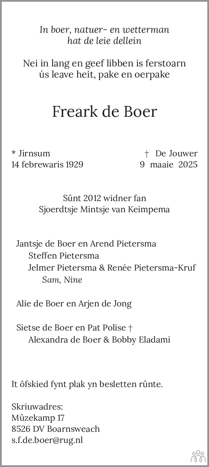Jirnsum op 14 februari 1929 •Joure op 9 mei 2025