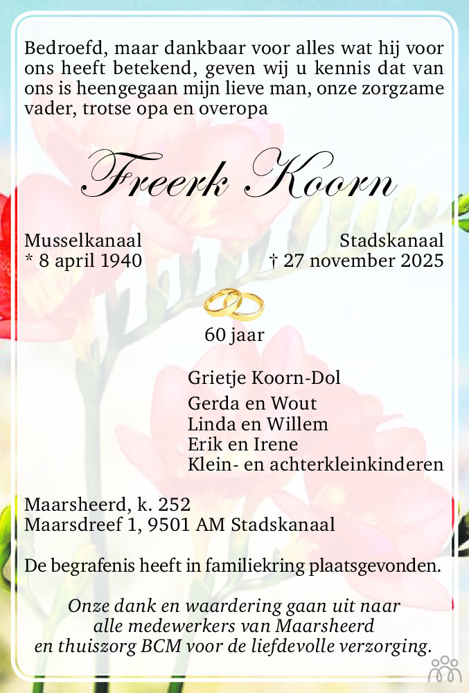 Beste Familie Koorn. Gecondoleerd met het overlijden van jullie dierbare man, vader en opa. We wensen jullie veel sterkte met het verwerken van dit verlies.