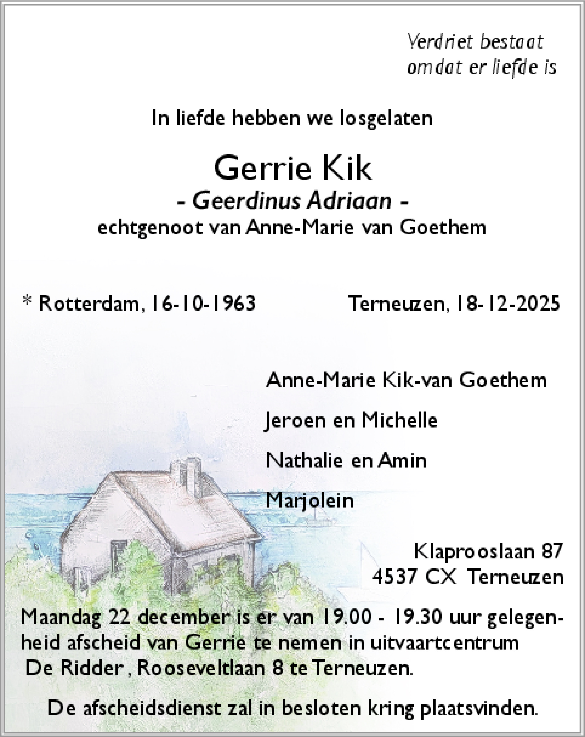 Heel veel sterkte voor allen die Gerrie lief hadden. Gerrie is mijn neef maar de laatste keer dat ik hem zag is zeker 25 jaar geleden. Ome Ger en tante Jeanne en nicht Marjan ook voor jullie sterkte met dit verlies.