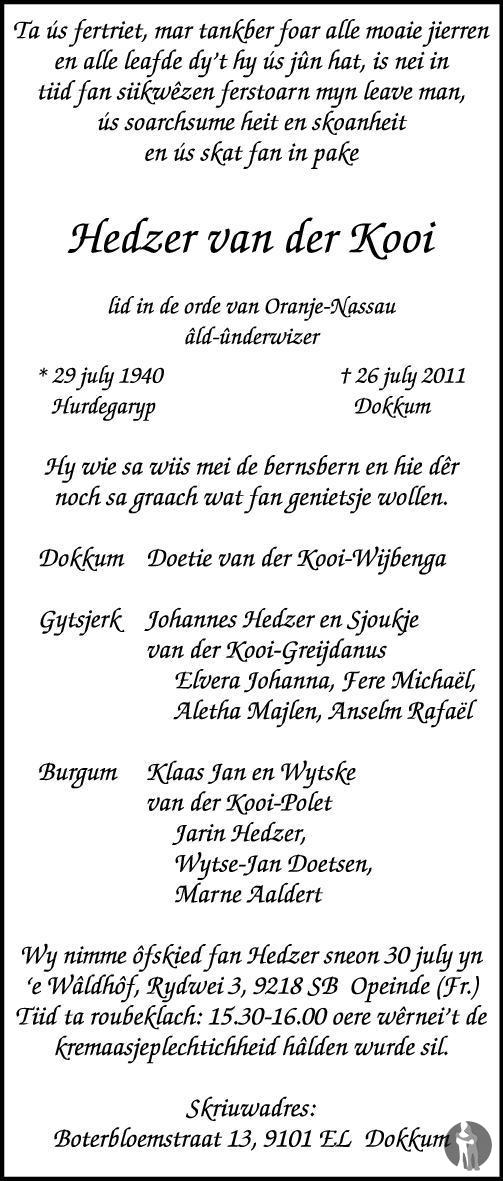 Ik herinner me Hedzer van der Kooi als een fijne meester met veel gevoel voor humor en die geweldig kon vertellen. Later werd het een directe collega van me waarvoor ik veel respect had. Ik wens Doetie en de kinderen heel veel sterkte toe voor de komende tijd. Een fijn mens is heengegaan....