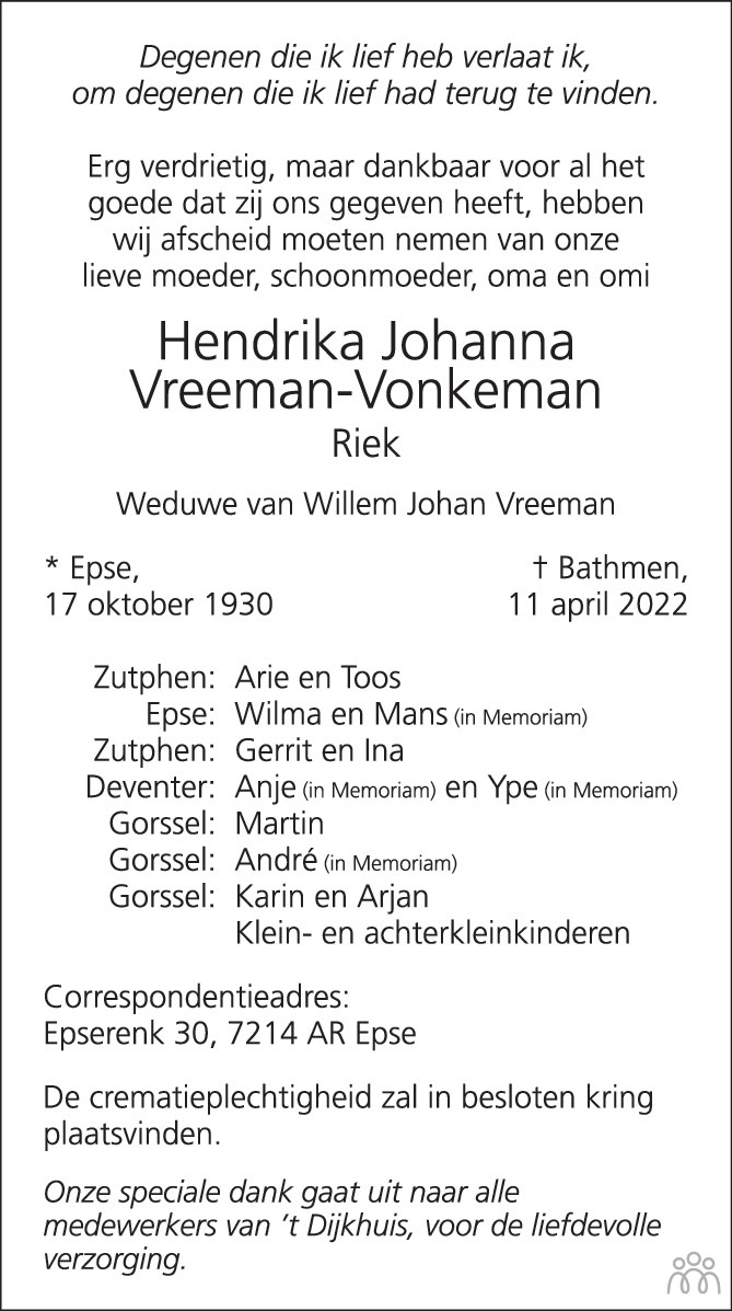 Hendrika Johanna (Riek) Vreeman-Vonkeman