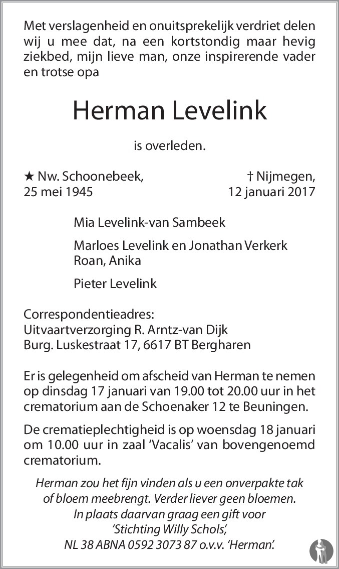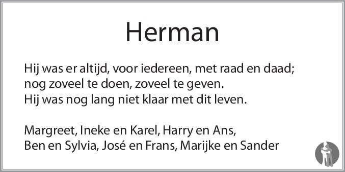Voor mij was Herman een inspirerend mens. Hij had veel ideeën en het doorzettingsvermogen om ze tot uitvoer te brengen. Onvermoeibaar en met veel respect voor zijn omgeving werkte hij aan zijn plannen. Tevens kon hij goed relativeren en ook zijn eigen bijdrage in perspectief plaatsen. Hij kon daarnaast goed luisteren en ik voelde me bij hem altijd 'gehoord'. Ik wens ons die achterblijven en met name zijn directe naasten net zo veel levensmoed toe als waarmee hij het leven tegemoet trad.