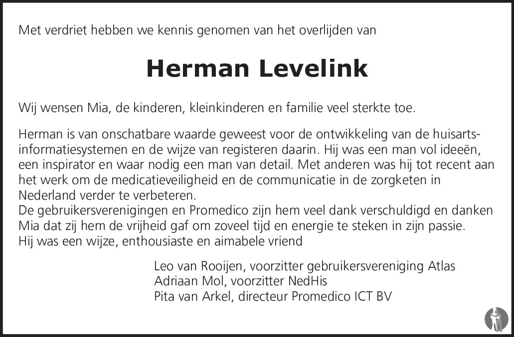 Herman was voor mij een hoog gewaardeerde collega. Als oud promedicaan zijn we lange tijd gelijk op gelopen, samen met mijn echtgenote Anika, die ooit in de raad v toezicht bij Promedico zat. Op een bepaald moment gingen onze inzichten over ICT verschillen en zijn we uit elkaar gedreven. De waardering voor zijn kennis, kunde en integriteit is er niet minder om. Ik wens zijn vrouw en kinderen alle sterkte toe, mede namens Anika