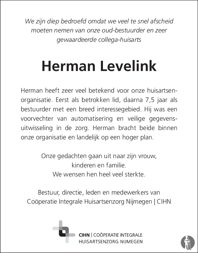 Herman laat veel goede herinneringen achter. Voor mij, als collega huisarts, stond hij altijd klaar als er problemen waren met ICT cq Promedico. Of hij wist hoe we verder moesten of hij wist bij wie we anders moesten zijn. Altijd positief en zeer gedreven. Heel veel sterkte.