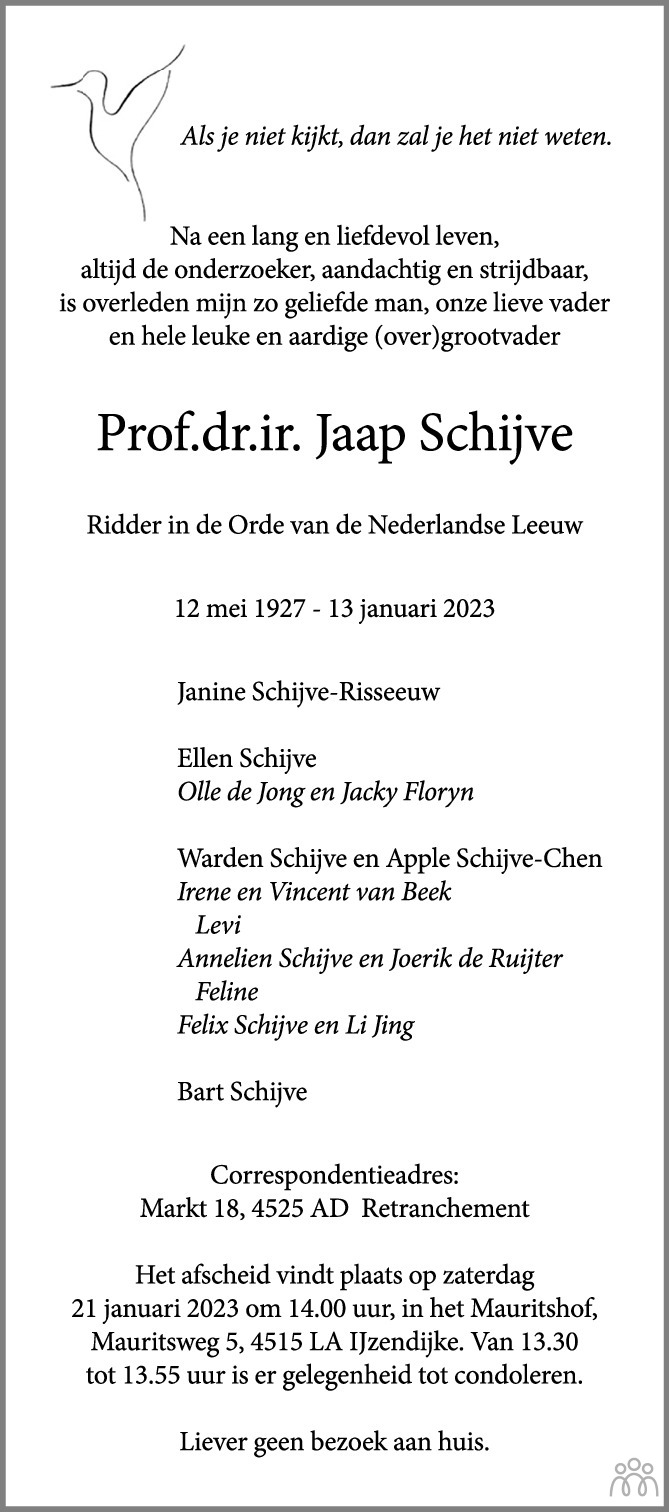 Geachte Mw. Schijve en familie,