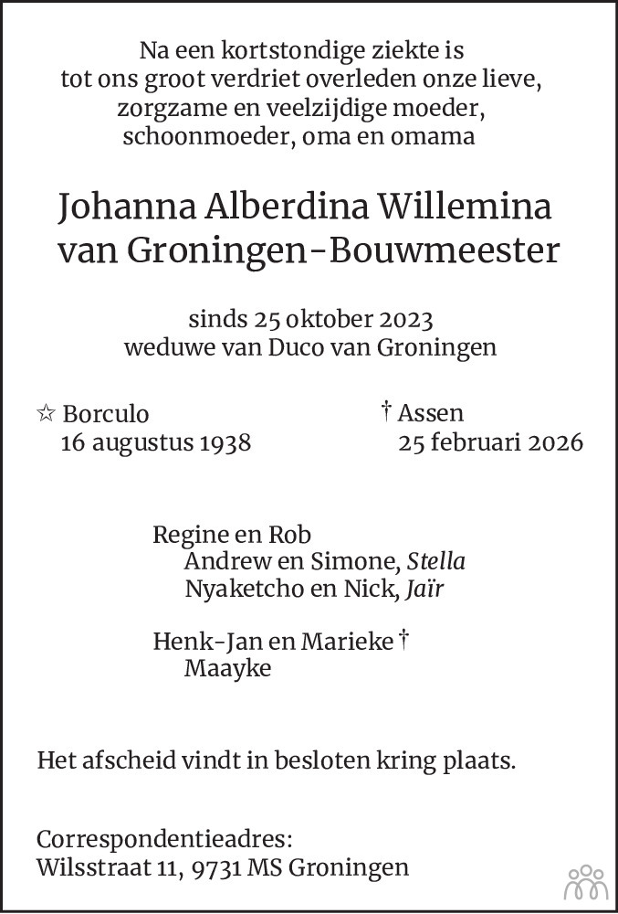 Borculo op 16 augustus 1938 •Assen op 25 februari 2026