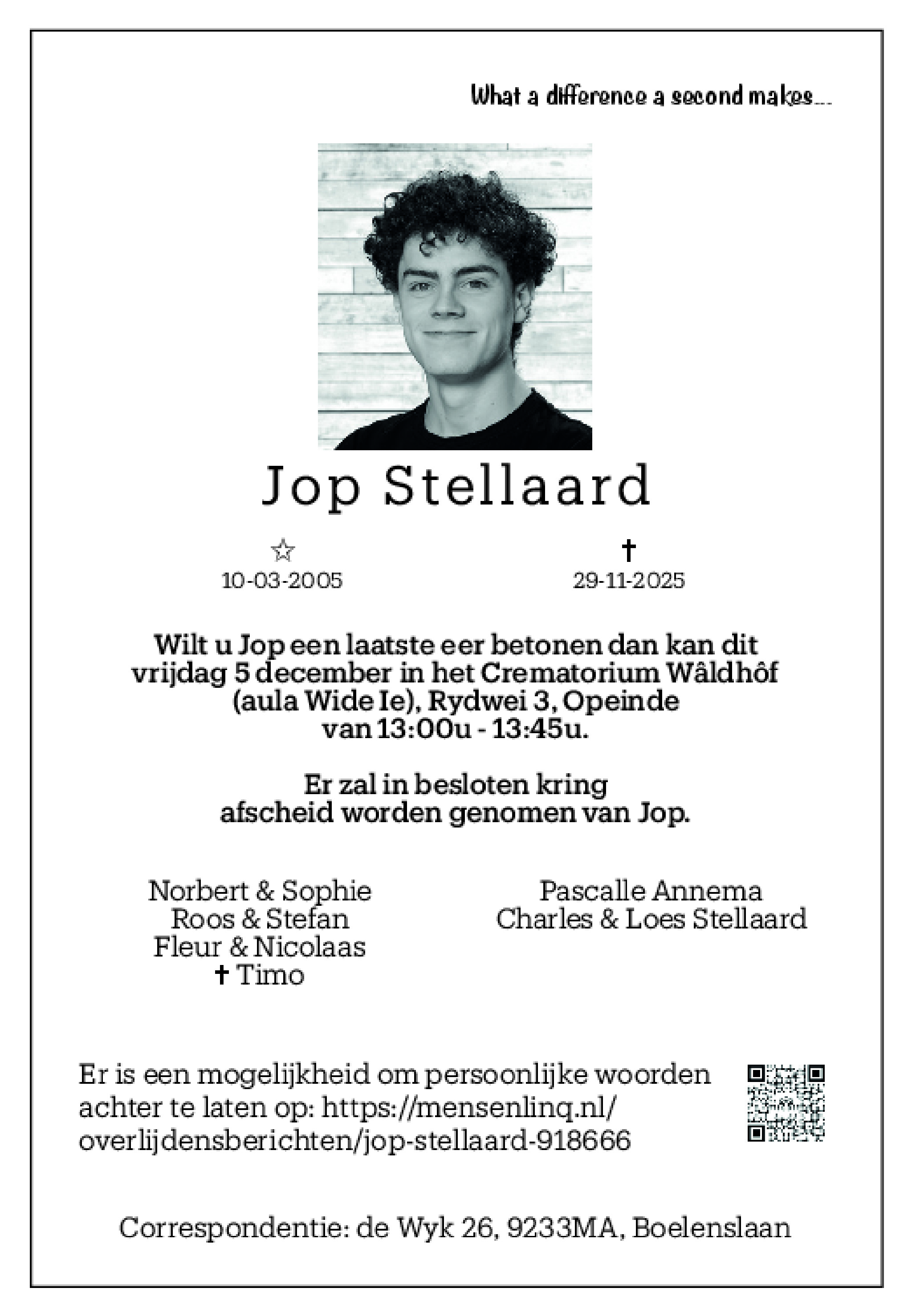 Jop stond in de bloei van zijn leven. Was zeer geliefd in zijn omgeving, een sterk sociaal karakter die altijd voor iedereen klaar stond. Hij werd geboren in Tilburg, woonde tot zijn 4e in Hardinxveld-Giessendam en groeide op in Capelle ad IJssel waar hij op zijn 14e verhuisde naar het prachtige Friesland.