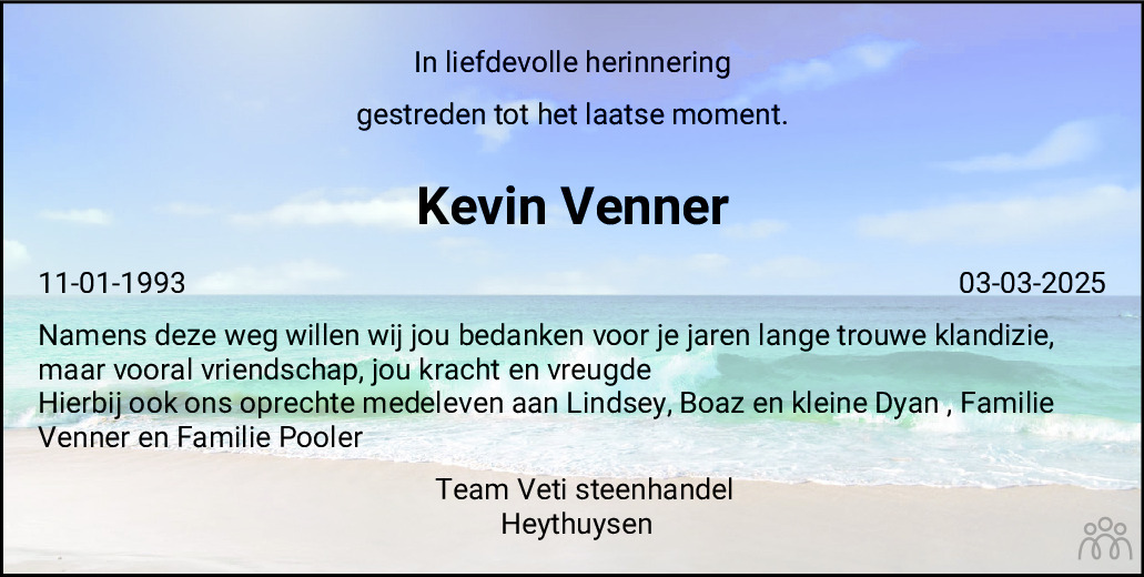 Mijn oprechte deelname aan het overlijden van Kevin. Veel te jong.
