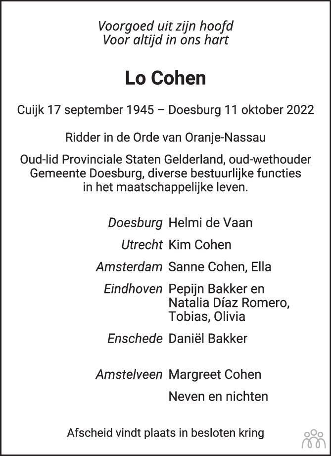 Van het koperblaaskwartet dat in 1963 bij de Nijmeegse Muziekschool optrad is er nu nog een lid over. Tijdens onze studietijd in Utrecht speeldën we weer jaren samen. Ik speelde trompet. Nadat Lo naar Doesburg was gegaan is het contact verwaterd. Nu definitief. Ik zag de filmpjes op internet bij toeval. Lo was in niets veranderd. Daar hebben veel mensen wat aan gehad.