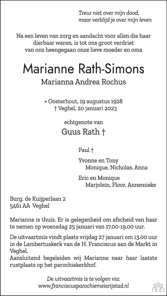 Beste Yvonne&Tony, Eric&Monique en kleinkinderen. Van harte gecondoleerd met het overlijden van jullie moeder en oma. Ik blijf haar herinneren als een hartelijk en warm persoon.Ik wens jullie sterkte voor de komende tijd.