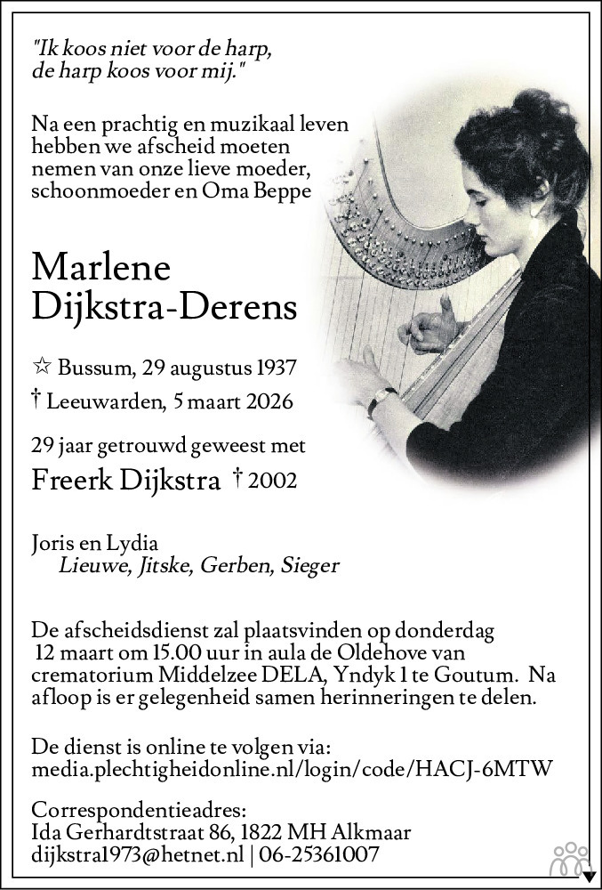 Bussum op 29 augustus 1937 •Leeuwarden op 5 maart 2026