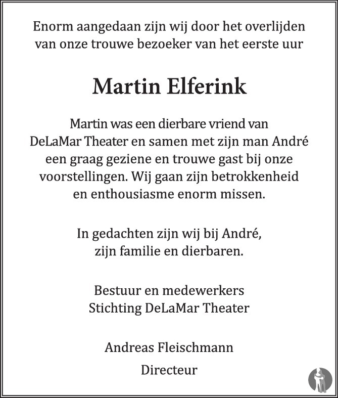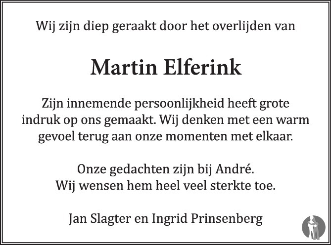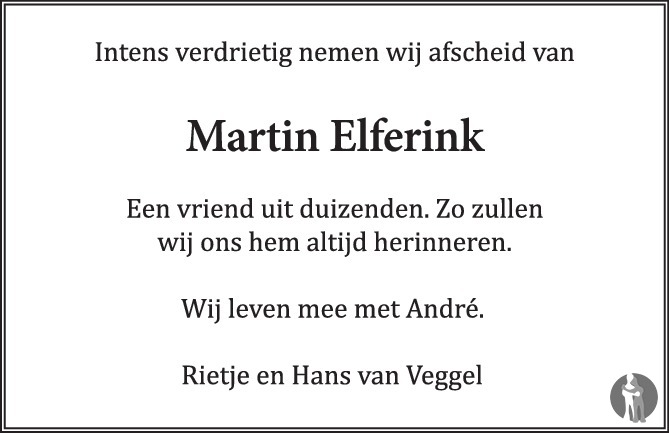 Ik ken Martin uit mijn jeugdjaren. We gingen altijd met een groep jongelui uit. Martin was een jongen waar je altijd terecht kon bij vreugde, maar ook verdriet. Ik verloor hem uit het oog toen hij van Deventer naar Den Haag vertrok en heb hem daarna nooit meer gezien. André, wanneer Martin nog net zo was zoals ik hem kende, begrijp ik dat je een maatje kwijt bent geraakt. Maar vergeten zal je hem nooit. Koester de herinneringen zoals ik dat ook zal blijven doen.
