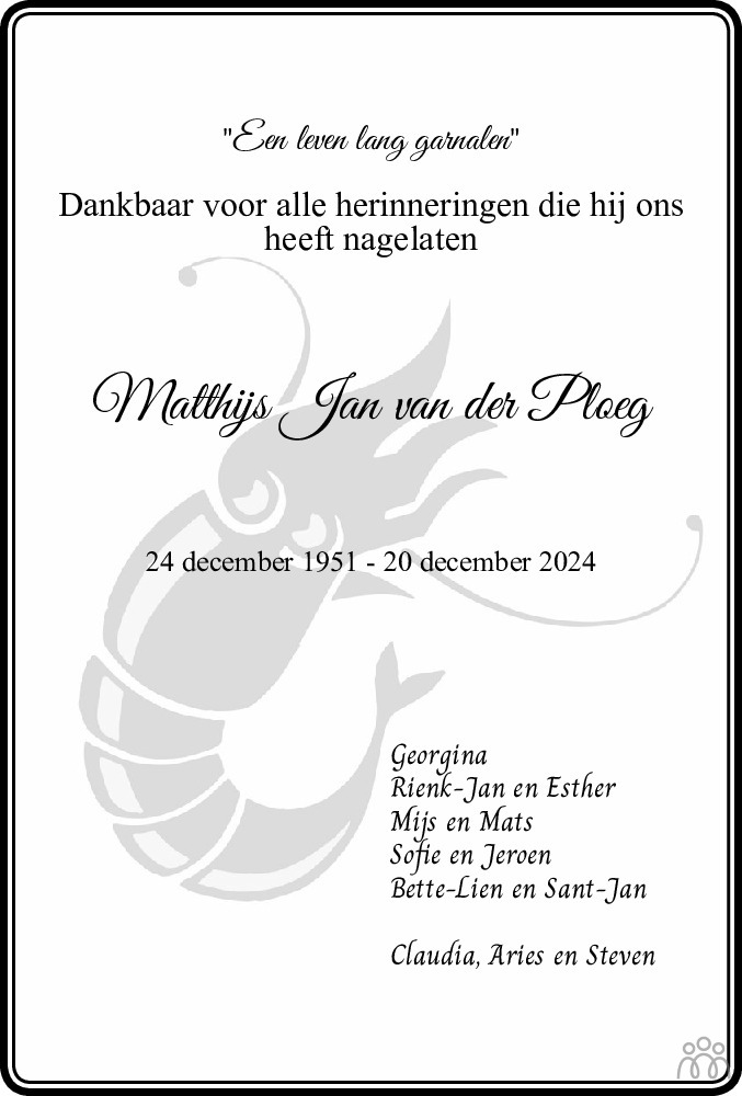 Bij deze wil ik de familie en naasten condoleren met het verlies van hun geliefde. Ik heb Matthijs als opdrachtgever leren kennen en vele jaren voor hem mogen werken. Een pure recht-door-zee vissersman met en groot strategisch inzicht en een eerlijk hart van goud. Die herinnering blijft.