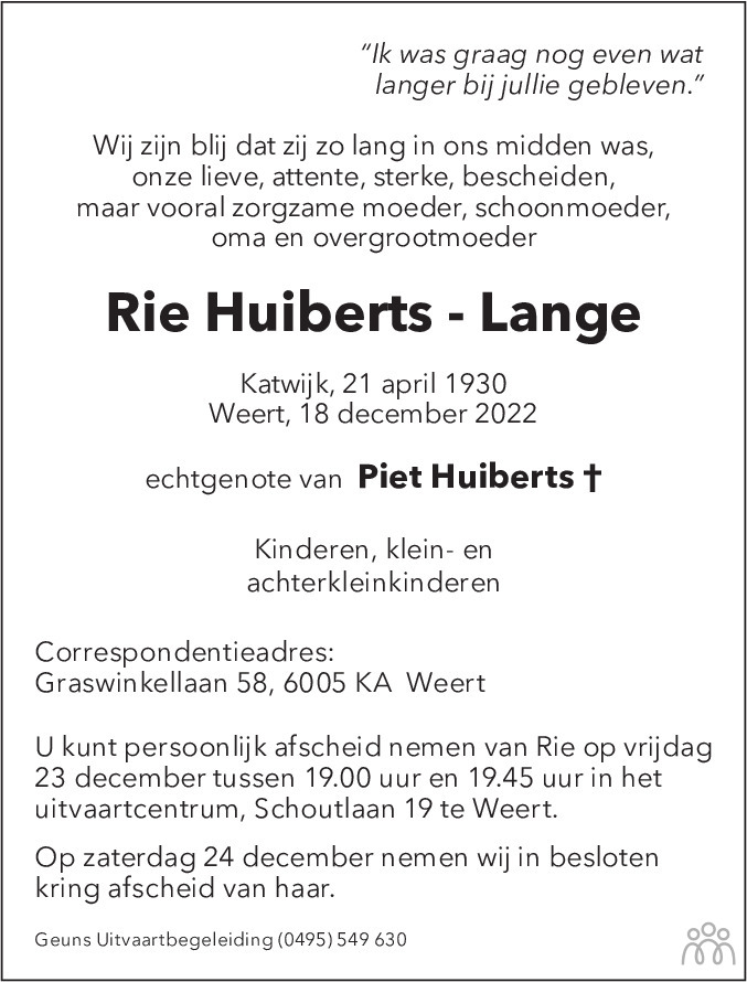 Katwijk (Nb) op 21 april 1930 •Weert op 18 december 2022