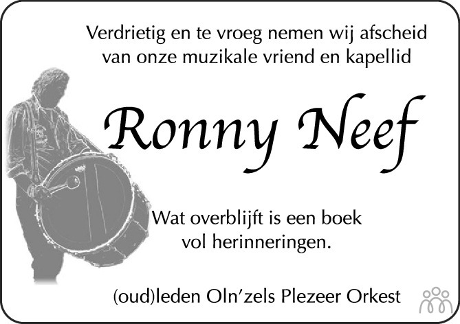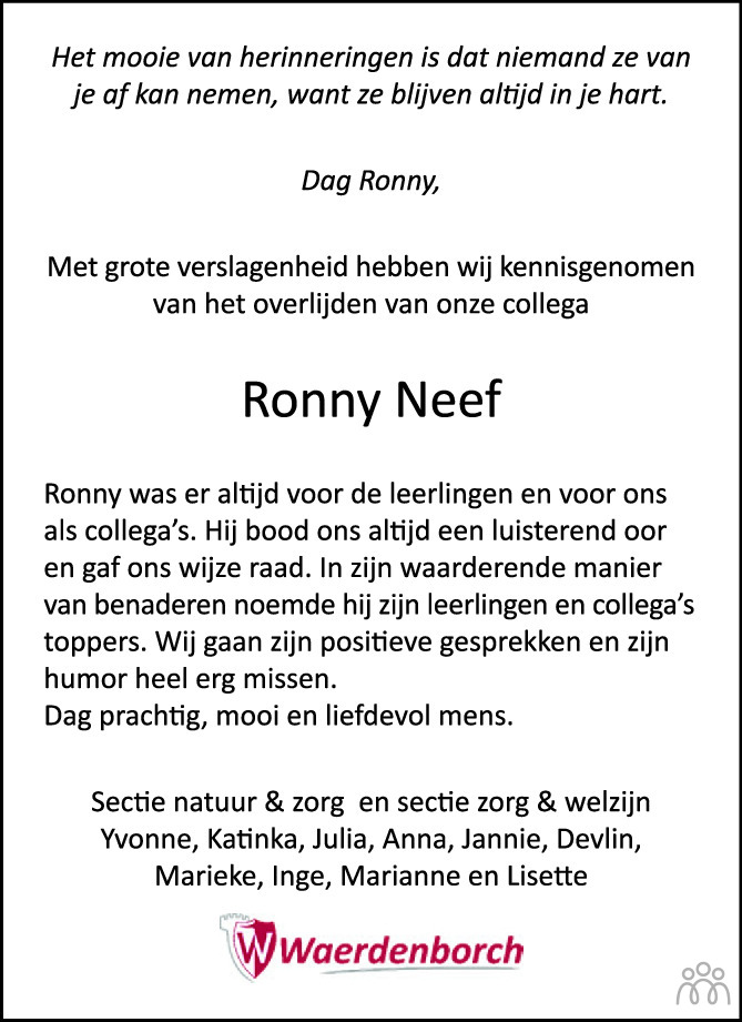 Wij wensen Jet, kinderen en kleinkinderen alle sterkte toe. Ronnie zal nooit vergeten worden. Wij zullen hem herinneren als een echte levensgenieter.
