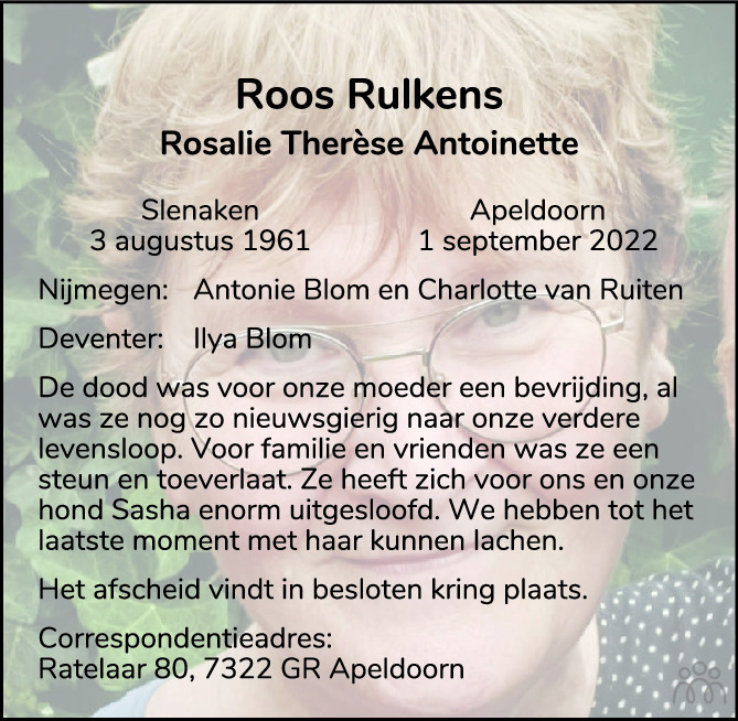 Lieve familie, ik ben sinds vanavond ontzettend geschrokken van t overlijden van Roos. Ik woon aan de Ratelaar en sinds een tijdje hadden wij, mijn man ook contact methaan. Zij heeft sokken voor ons gebreid en. ik heb haar enthousiast gemaakt om vlaggetjes te haken. Oh wat gaan wij haar missen als we langs lopen met ons hondje Jet. sterkte allemaal, heel veel kracht wens ik jullie toe. Ze is een prachtige lieve vrouw…dikke knuf van mij en Hans ❤️