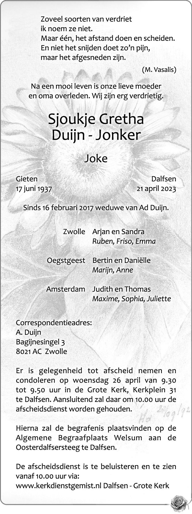 Sjoukje Gretha (Joke) Duijn-Jonker