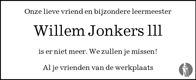 Willem Jonkers III. Zijn naam zal voortleven in de monumentale verguld ijzeren deuren naar de tuinen van Paleis Het Loo, sedert 1984 jaarlijks door meer driehonderd duizend bezoekers bewonderd.